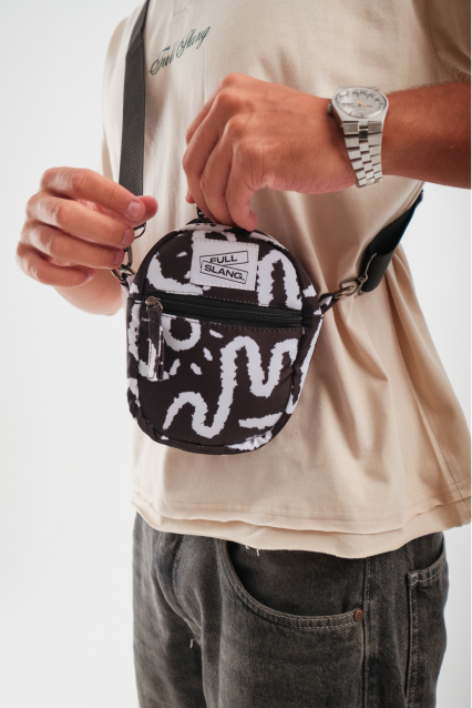 A small crossbody bag in colorful prints, with an adjustable shoulder strap, and a front pocket. Fits your phone, keys, wallet, and bubble pins ;)