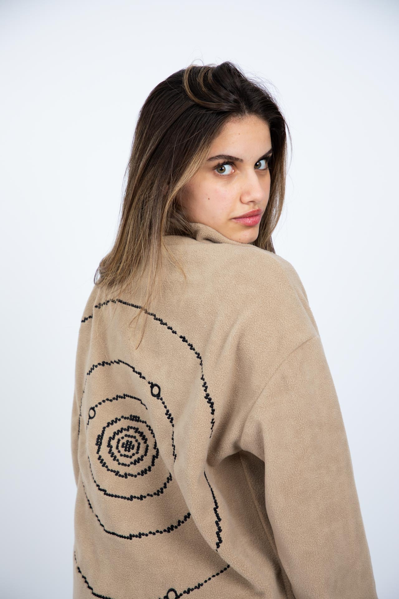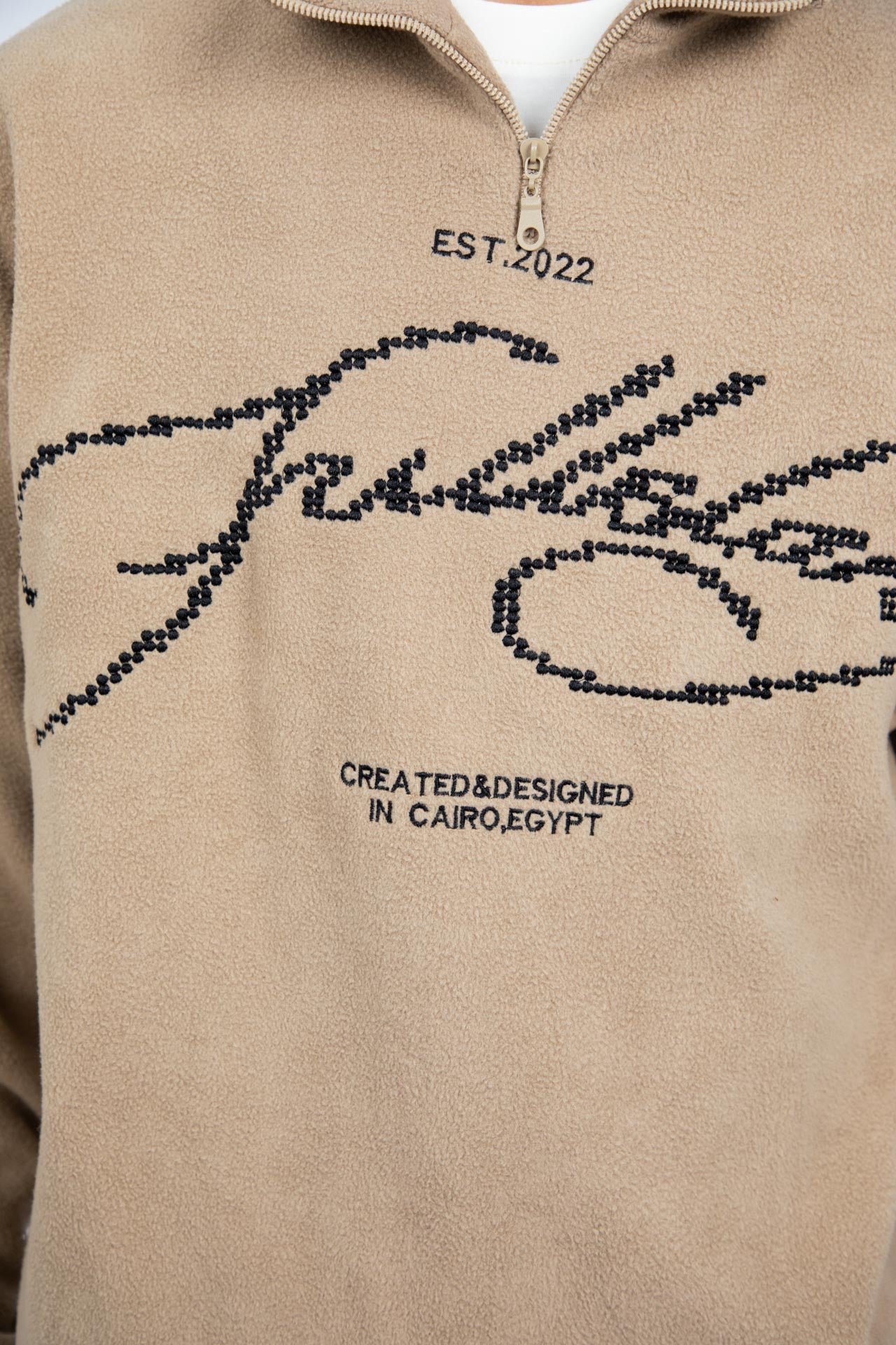 The Beige Quarter-Zip Fleece, crafted from ultra-soft material for unbeatable comfort. Featuring bold embroidered designs and a versatile zip-up collar in a relaxed fit for effortless style.