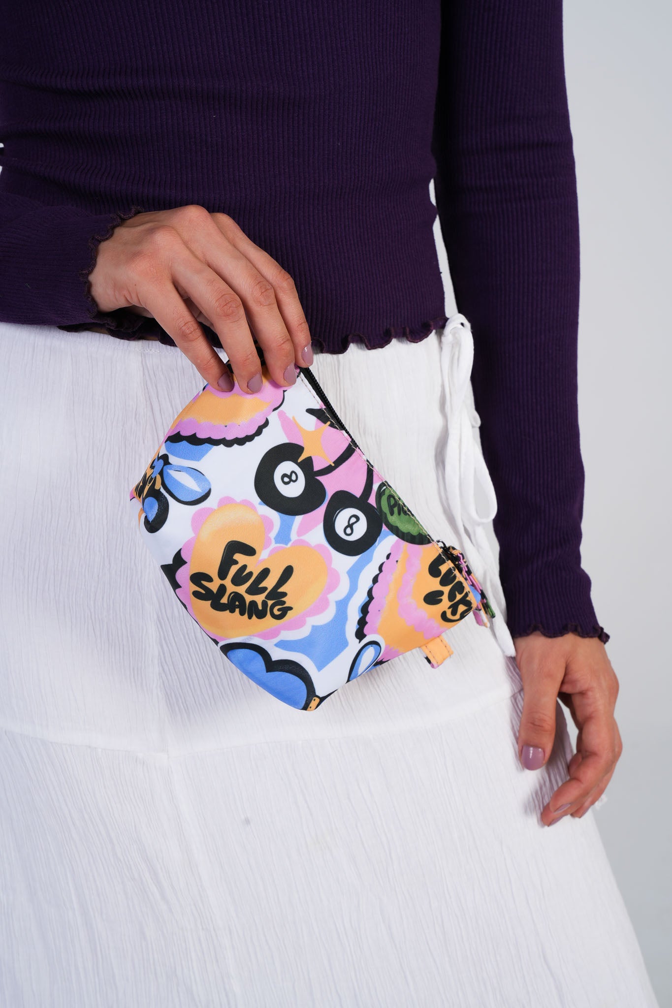 The waterproof pouch is your go-to for carrying essentials in style. Featuring Fullslang’s playful graphic print, it’s perfect for makeup, tech bits, or everyday must-haves.
