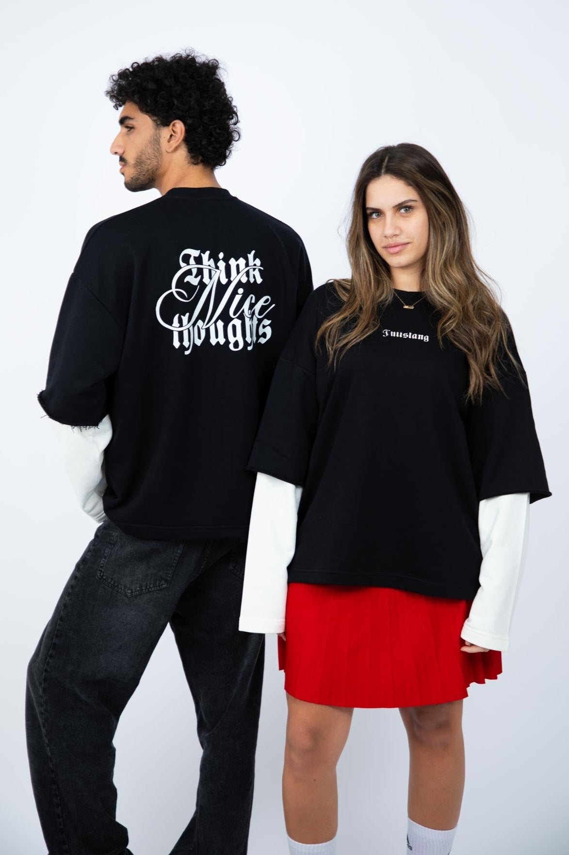 The Black & White Long Sleeve double layered combines bold design with everyday comfort. Featuring an oversized fit, and layered sleeve details with a printed design on the back.