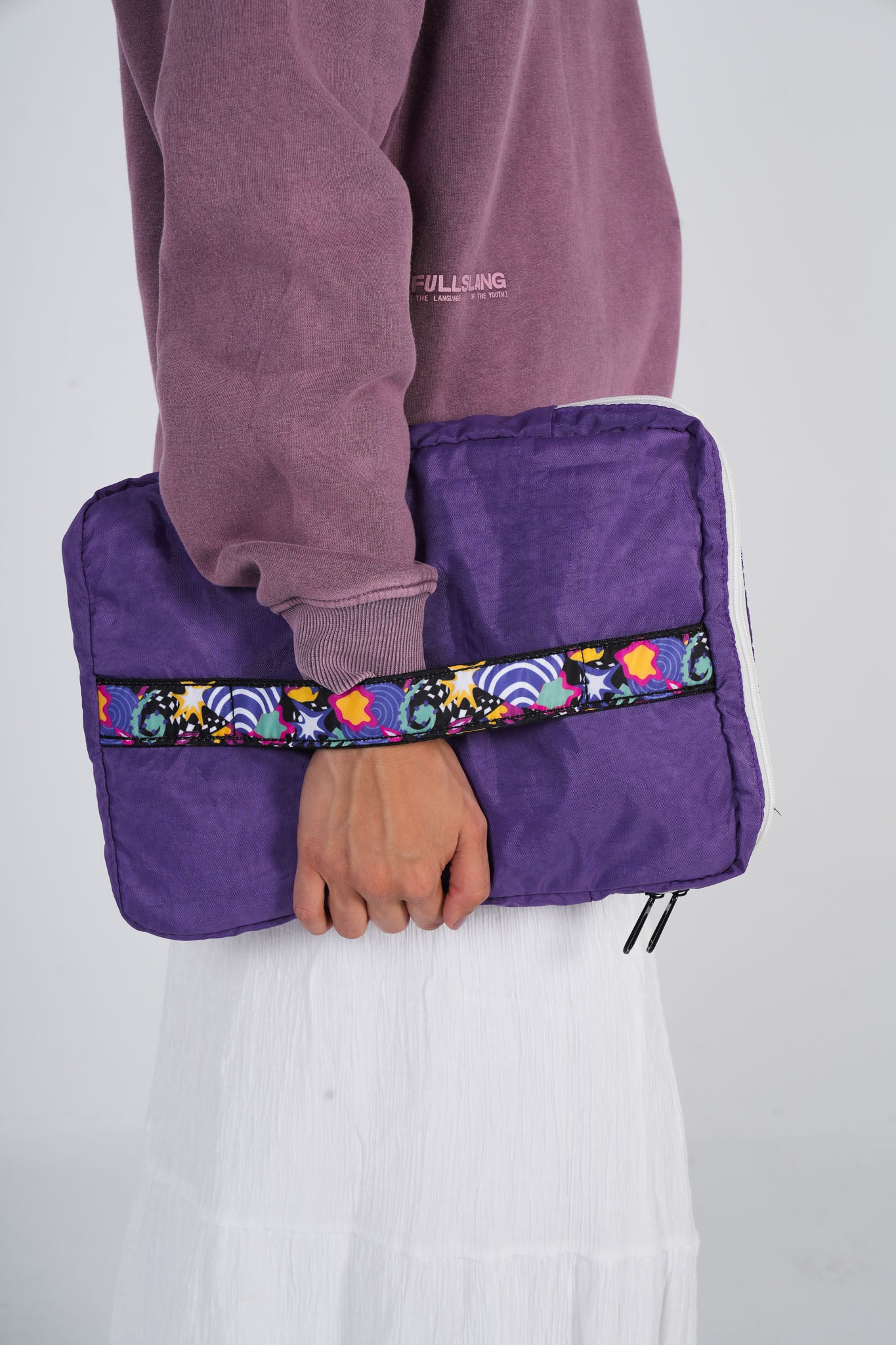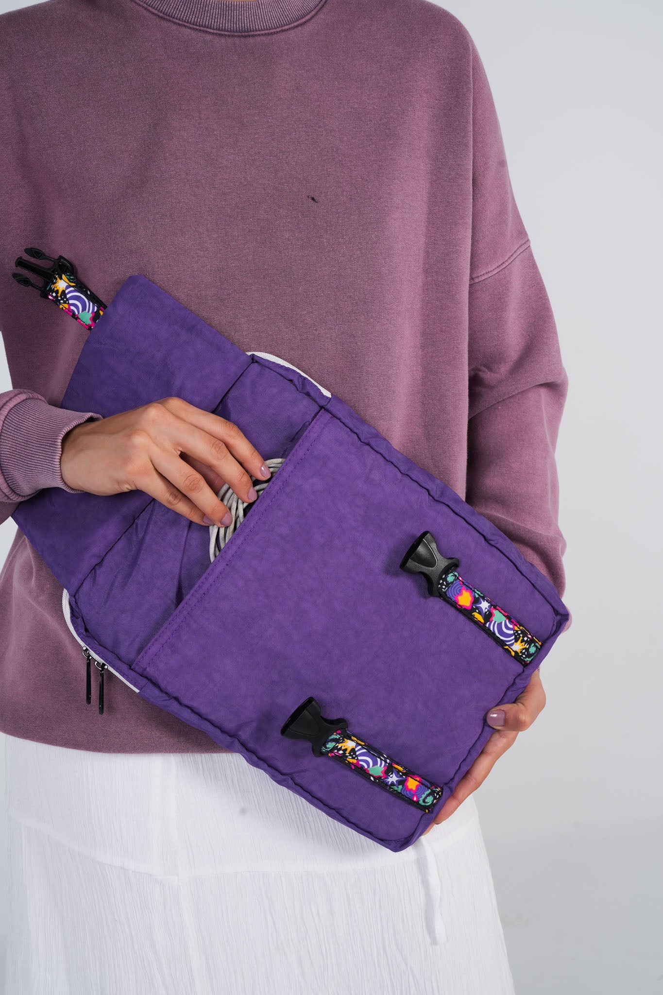 An exclusive laptop sleeve featuring a unique pocket buckle for holding chargers, notebooks, and more. Designed for easy, lightweight carrying with a back grip, it’s perfect for campus or commuting. Fully designed in-house, it's the first of its kind—combining style and practicality.