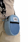 A small crossbody bag in baby blue, with an adjustable shoulder strap, and a front mesh panel. Fits your phone, keys, wallet, and bubble pins ;)