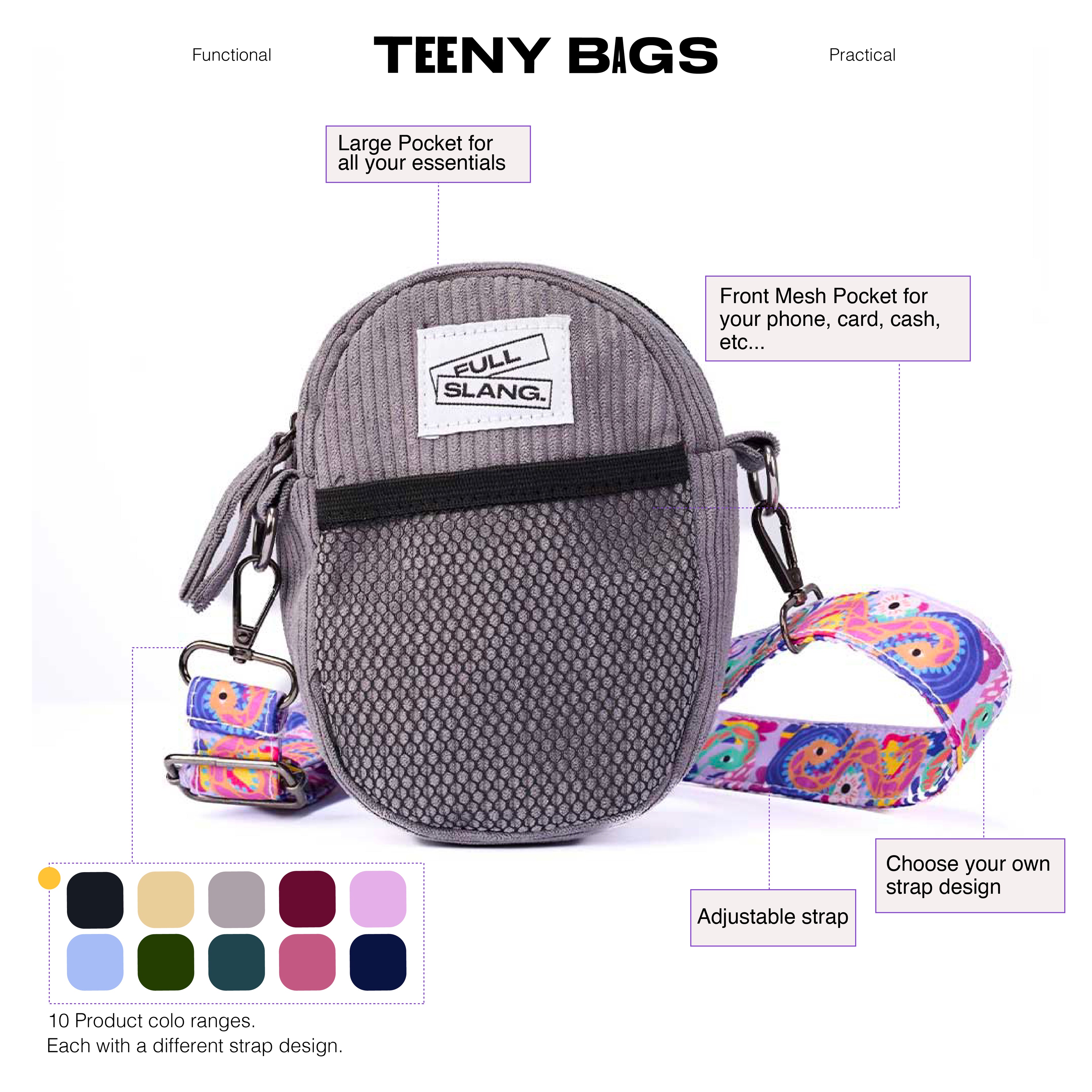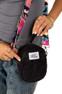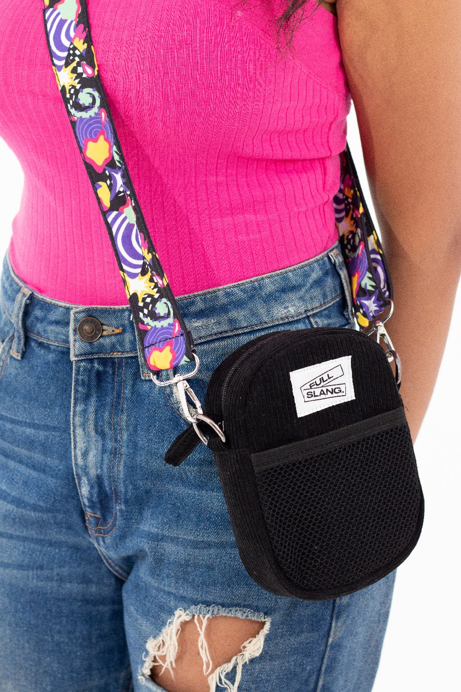 A small crossbody bag in black with a black net, with an adjustable shoulder strap, and a front mesh panel. Fits your phone, keys, wallet, and bubble pins ;)