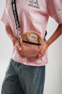 A small crossbody bag in Camel with a light pink net, with an adjustable shoulder strap, and a front mesh panel. Fits your phone, keys, wallet, and bubble pins ;)